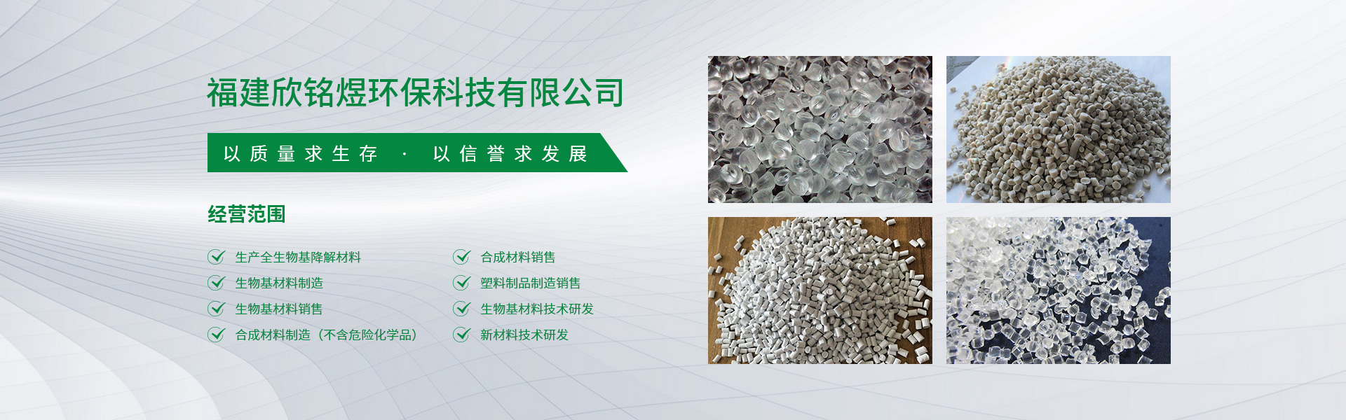 福建欣銘煜環保科技有限公司,位于福建泉州南翼國家高新區,響應國家節能減排和保護環境的號召,積極投入、專業致力于生物基全降解材料的研發、設計、制造、銷售、服務為一體的現代化制造企業。工廠占地2388㎡,全生物基降解材料生產流水線2條,年產全生物基降解材料10000T。制品適用于商超膜袋、刀叉勺、吸管、快遞及服裝包裝袋、農用地膜、機場纏繞膜、外賣餐盒及食品外包裝等多個領域。福建欣銘煜研發、生產的生物基全降解材料產品,完全符合國家及國際相關標準要求,由于其材料綠色、環境友好型、資源節約、無毒無害等特點,廣受客戶好評。